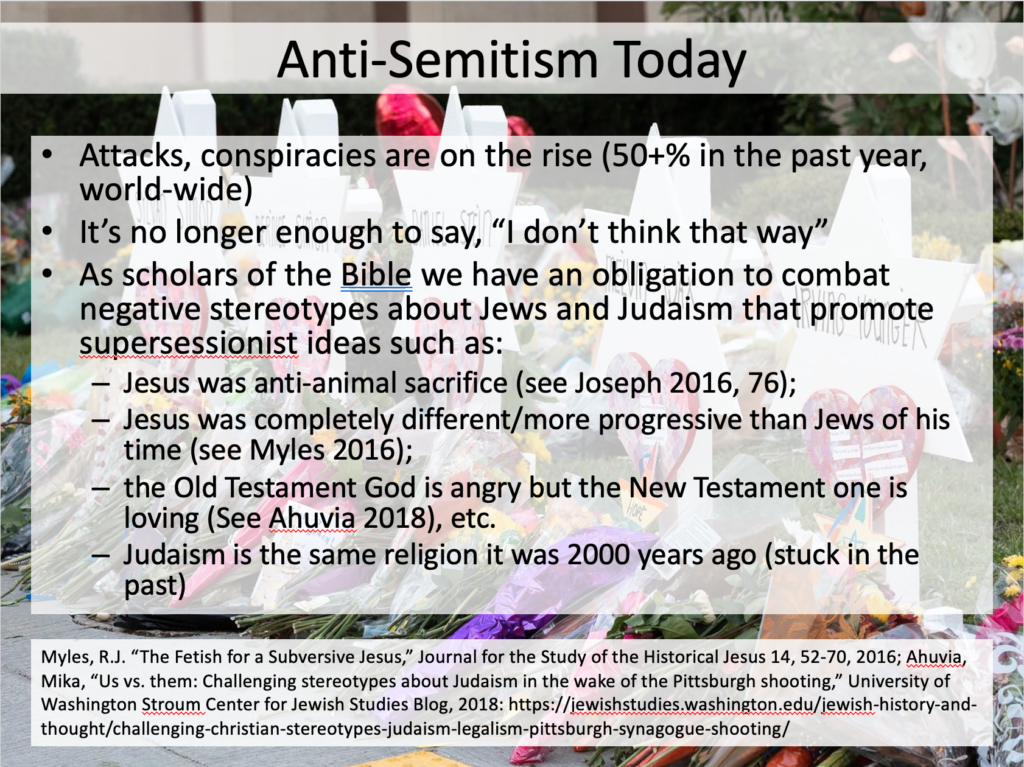 [45] References on this slide were linked for students to read on MOLE after the lecture. Mika Ahuvia, “Us vs. them: Challenging stereotypes about Judaism in the wake of Pittsburgh shooting,” Medium 2 November 2018, https://medium.com/@mikaahuvia/us-vs-them-challenging-stereotypes-about-judaism-in-the-wake-of-pittsburgh-shooting-2b56710321d4; Myles, Robert J. “The Fetish for a Subversive Jesus.” Journal for the Study of the Historical Jesus 14, no. 1 (2016): 52–70; Joseph, Simon J. “Jesus and the Temple Incident: A New Proposal.” Journal for the Study of the Historical Jesus 14, no. 1 (2016): 71–95. I also include a link to the library copy of Jesus, Judaism, and Christian Anti-Judaism: Reading the New Testament after the Holocaust (Paula Fredriksen and Adele Reinhartz, eds; Louisville, KY: Westminster John Knox Press, 2002).